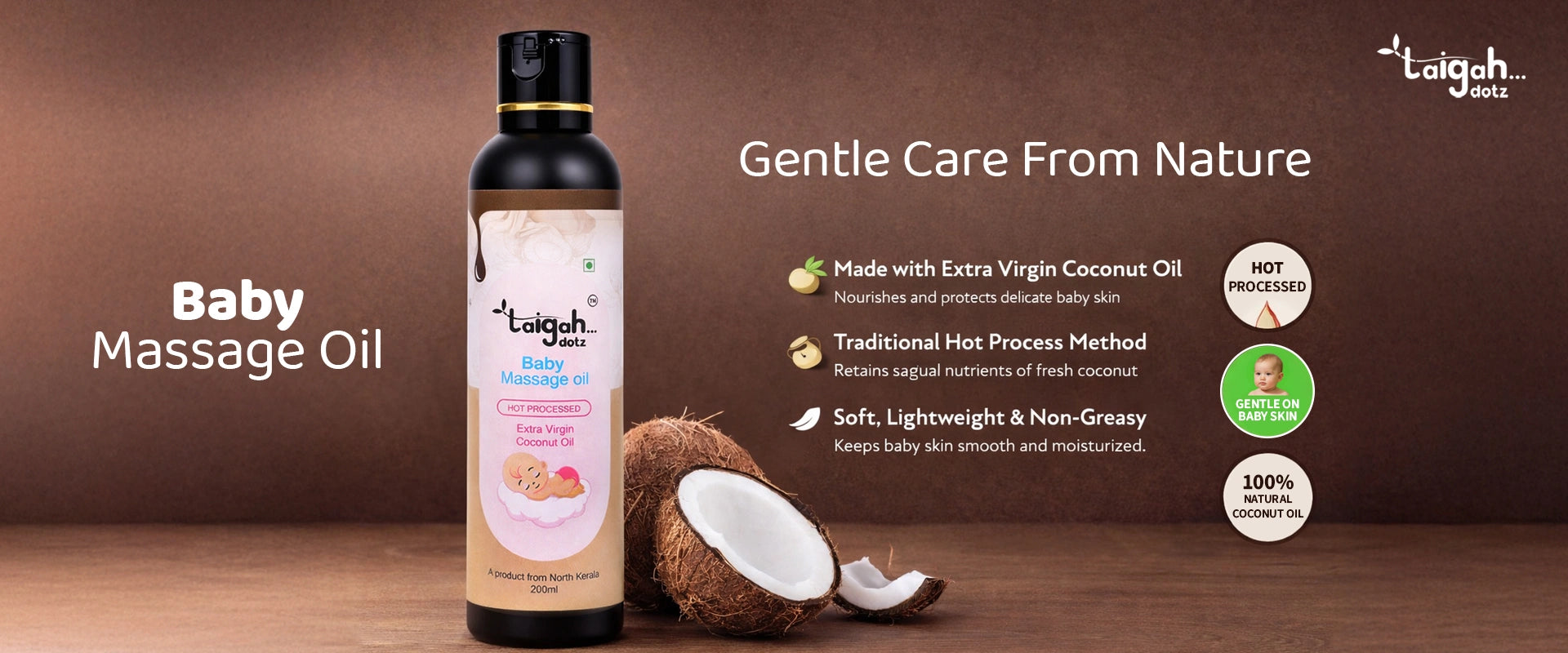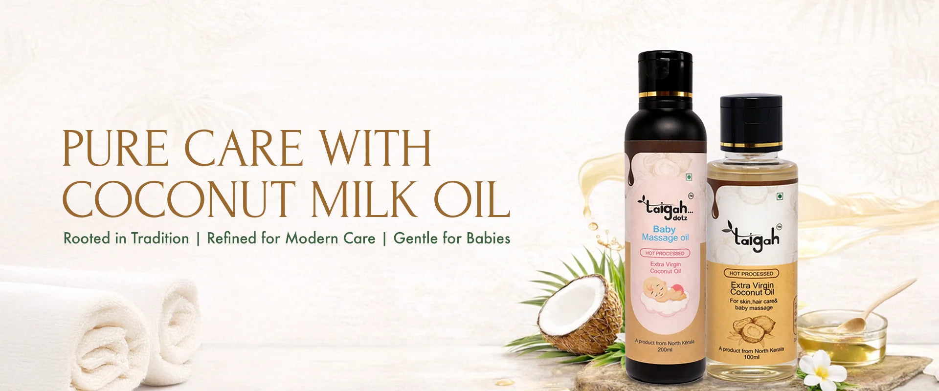 Welcome to Taigah dotz, where purity meets tradition. Crafted in North Kerala through time-honored hot processing methods, our coconut oil delivers deeper nourishment, lasting freshness, and uncompromised purity—for your skin, hair, and your baby