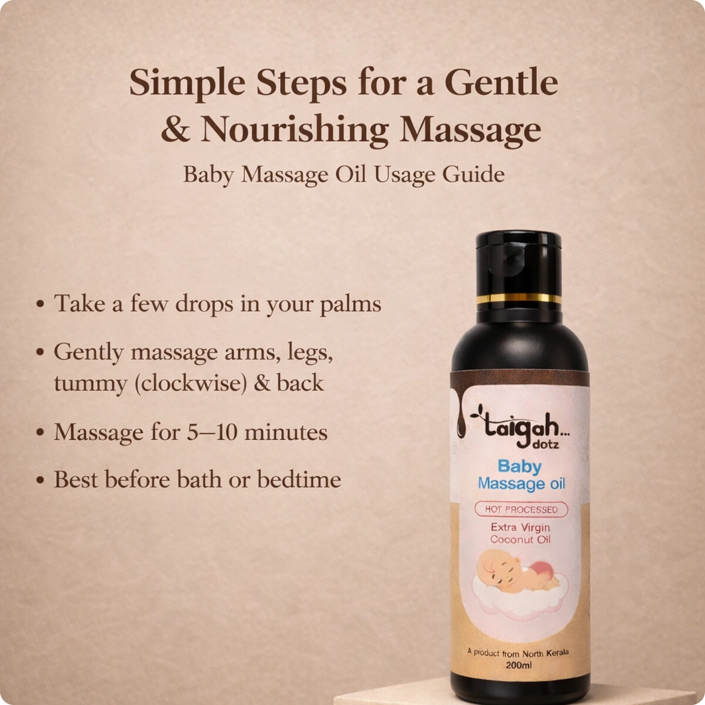 Thoughtfully crafted using hot-processed Extra Virgin Coconut Oil sourced from the rich coconut groves of North Kerala. Designed especially for delicate baby skin, this light and gentle oil nourishes deeply, locks in moisture, and helps support healthy skin and overall well-being.